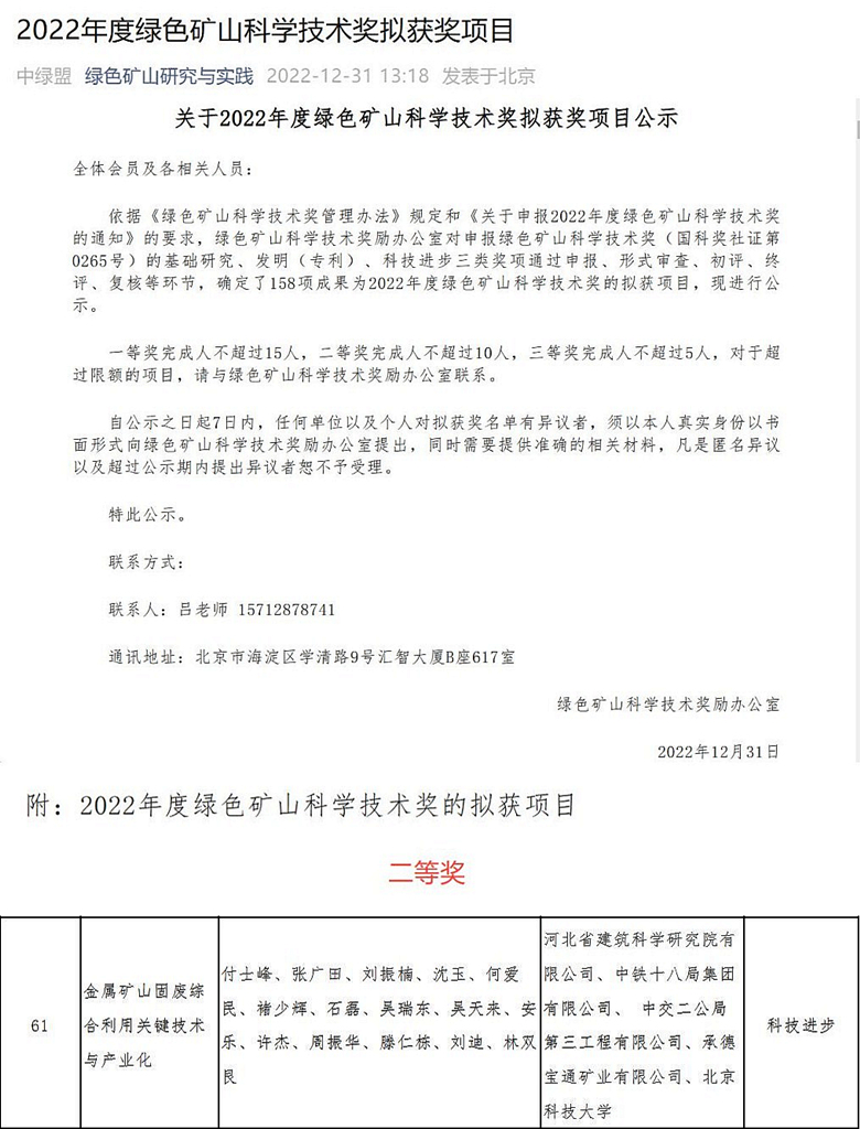 我公司申報(bào)的“金屬礦山固廢綜合利用關(guān)鍵技術(shù)與產(chǎn)業(yè)化”項(xiàng)目依據(jù)《綠色礦山科學(xué)技術(shù)獎(jiǎng)管理辦法》規(guī)定和《關(guān)于申報(bào)2022年度綠色礦山科學(xué)技術(shù)獎(jiǎng)的通知》的要求,經(jīng)綠色礦山科學(xué)技術(shù)獎(jiǎng)勵(lì)辦公室對(duì)申報(bào)綠色礦山科學(xué)技術(shù)獎(jiǎng)(國(guó)科獎(jiǎng)社證第0265號(hào))的基礎(chǔ)研究、發(fā)明(專利)、科技進(jìn)步三類獎(jiǎng)項(xiàng)通過(guò)申報(bào)、形式審查、初評(píng)、終評(píng)、復(fù)核等環(huán)節(jié),確定我公司申報(bào)的“金屬礦山固廢綜合利用關(guān)鍵技術(shù)與產(chǎn)業(yè)化”榮獲2022年度綠色礦山科學(xué)技術(shù)獎(jiǎng)二等獎(jiǎng)。