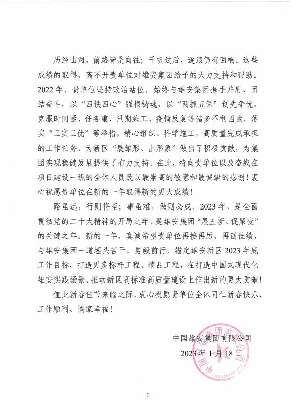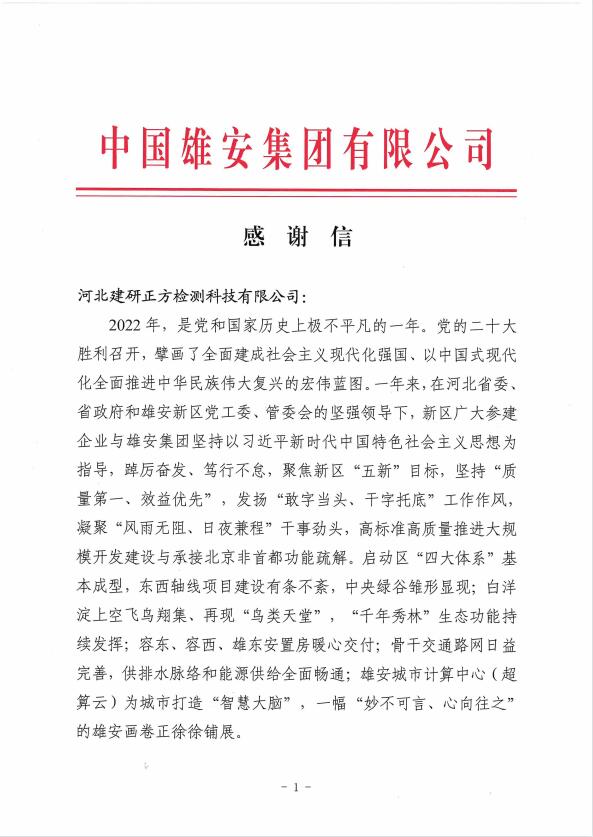 近日,建研正方公司收到雄安集團(tuán)發(fā)來的感謝信,對建研正方公司2022年為雄安新區(qū)發(fā)展建設(shè)所做出貢獻(xiàn)表示感謝。